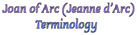 This page lists names, places and terminology associated with the remarkable 15th Century C.E. French girl Joan of Arc (Jehanne Darc, Jeanne d'Arc), also known as The Maid of Orléans (La Pucelle d'Orléans), whose life and death has resonated through the centuries on Earth. Her life, faith, battles against the English, trial by the church and martyrdom have been portrayed in books, movies, television programs and stage plays, although most productions do not show that catapults and early cannons (culverins) were used in some of the battles, that she was locked in an iron cage after her capture or was forced to wear a paper hat at her execution. She continues to inspire people more than 600 years after she lived.