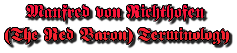 Below you will find terminology, names and places relating to the life of German pilot Manfred Freiherr von Richthofen (1892-1918), the top ace of World War I with 80 confirmed victories, and the flying services of other countries. Von Richthofen is best known as The Red Baron or Der Rote Kampfflieger. He remains one of the most famous pilots in Earth history with many books devoted to him.